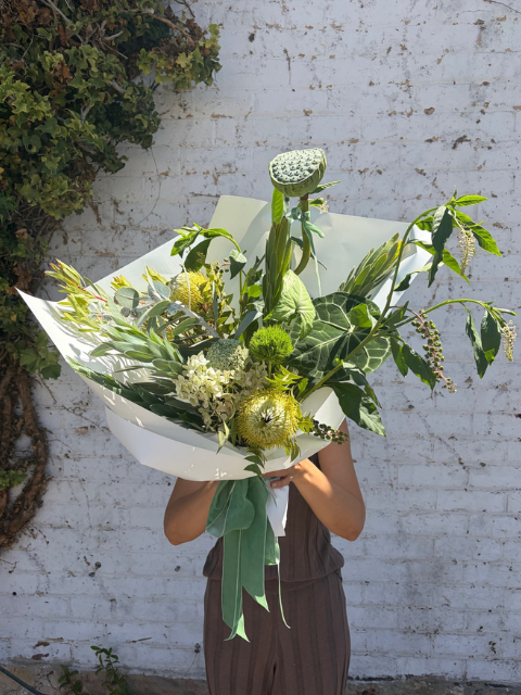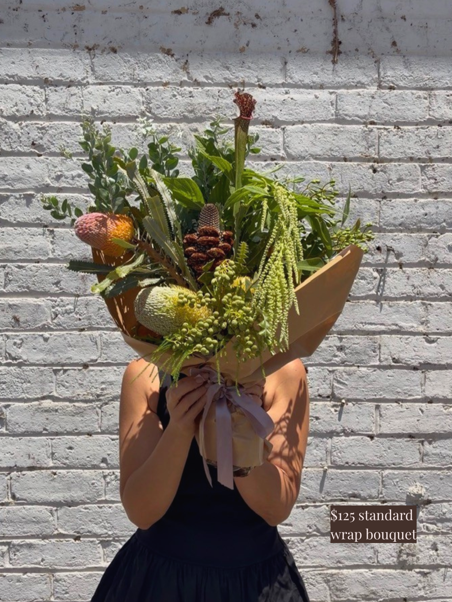 Pictured is a $150 standard wrapped bouquet. Please scroll through the images for a general size guide. Please note all of our bouquets are unique and created based on what is fresh and in season. Images are examples only - slight variation in colour and size can occur depending on the specific flower varieties available.