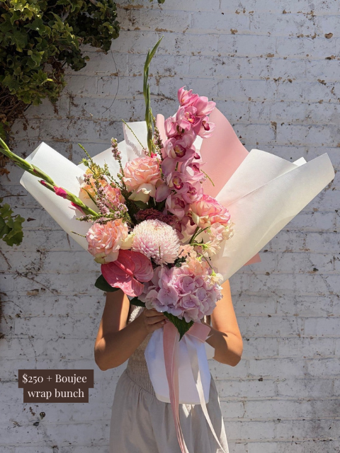 Pictured is a $200 boujee wrapped bouquet. Please scroll through the images for a general size guide. Please note all of our bouquets are unique and created based on what is fresh and in season. Images are examples only - slight variation in colour and size can occur depending on the specific flower varieties available.