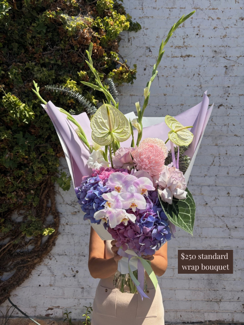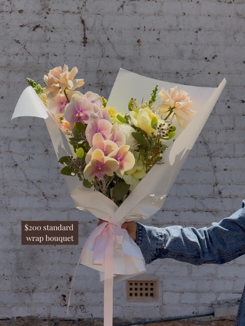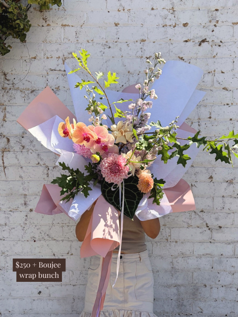 Pictured is a $250 boujee wrapped bouquet. Please scroll through the images for a general size guide. Please note all of our bouquets are unique and created based on what is fresh and in season. Images are examples only - slight variation in colour and size can occur depending on the specific flower varieties available.